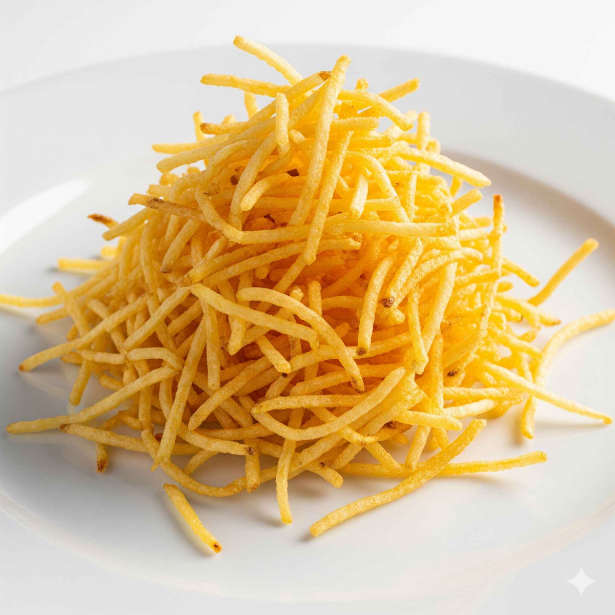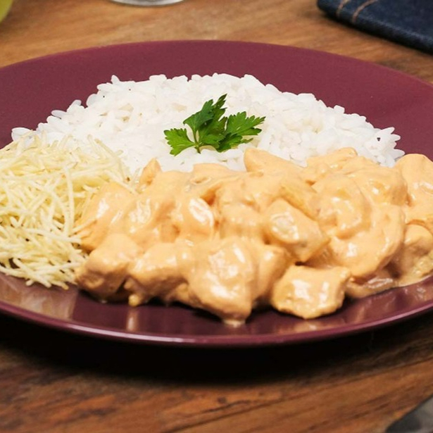Strogonoff de frango bem cremoso acompanhado de arroz branco soltinho e batata palha crocante.