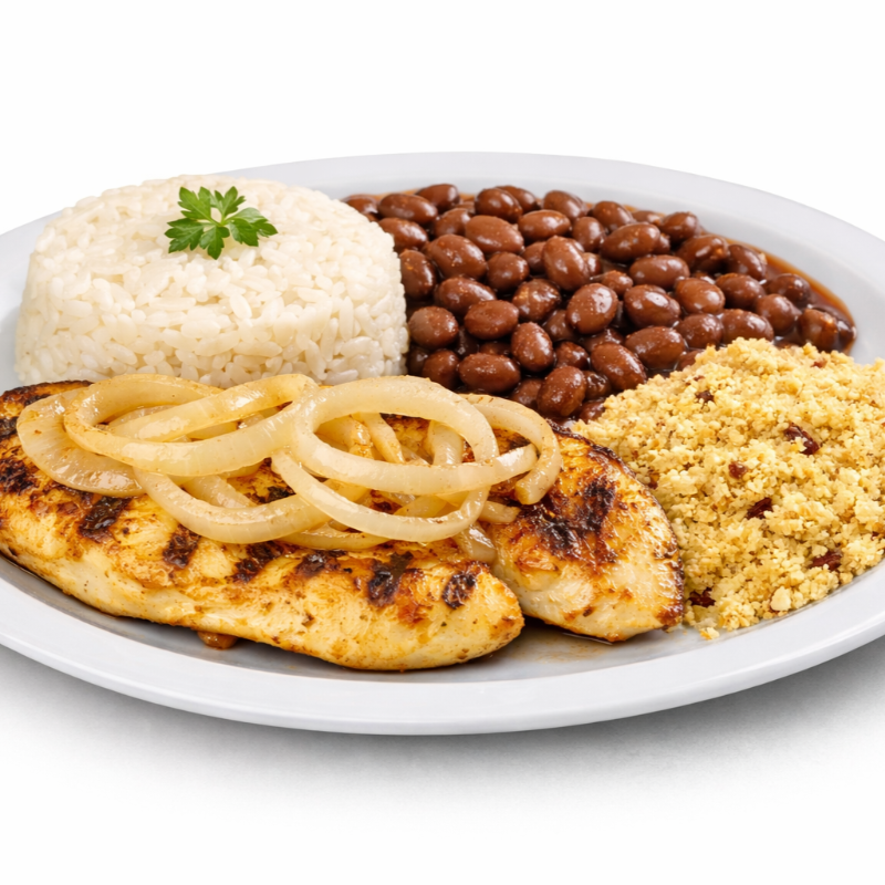 Arroz branco, feijão, filé de peito de frango e farofa. Obs: Sem a BATATA FRITA.