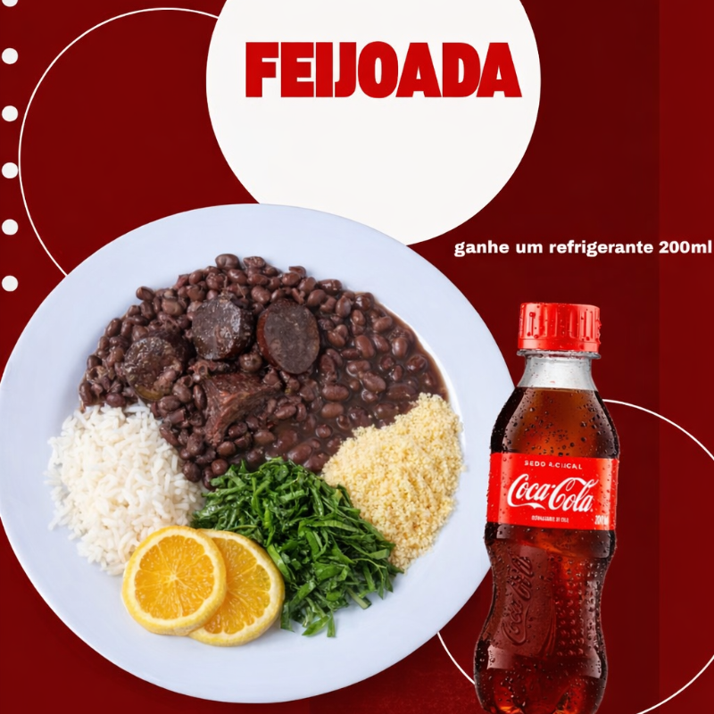 Aproveite o sabor autêntico da nossa feijoada completa — com arroz branco, couve, farofa e laranja — acompanhada de uma geladíssima Coca-Cola lata 350ml.
