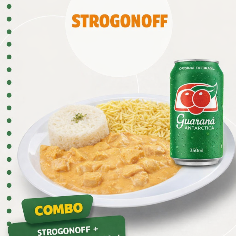 Delicie-se com nosso strogonoff cremoso de frango, servido com arroz soltinho e batata palha crocante. Para completar, uma lata gelada de Guaraná Antarctica 350ml — o sabor Original do Brasil! Ideal para quem busca sabor e refrescância em uma só refeição.