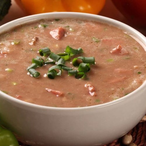 caldo de feijao 500 ml com acompanhamento de cheiro verde e torresmo