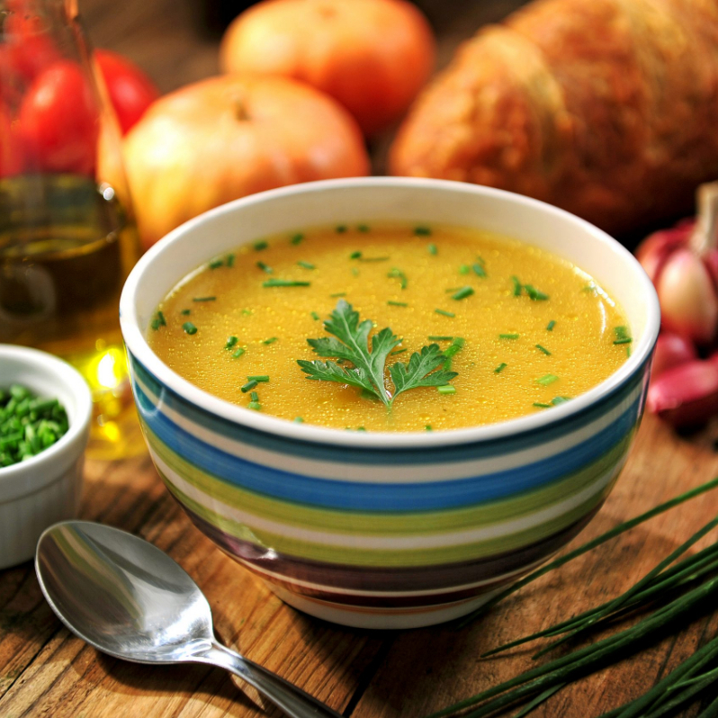 caldo de frango350 ml com acompanhamento de cheiro verde e torresmo