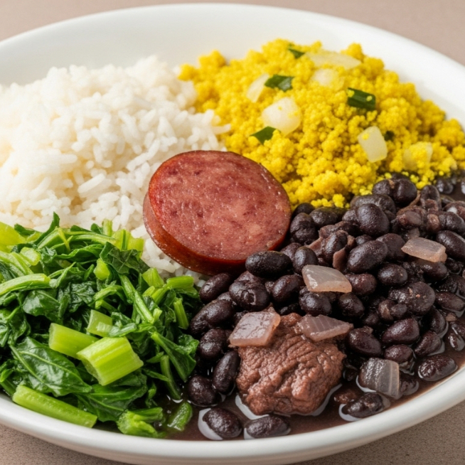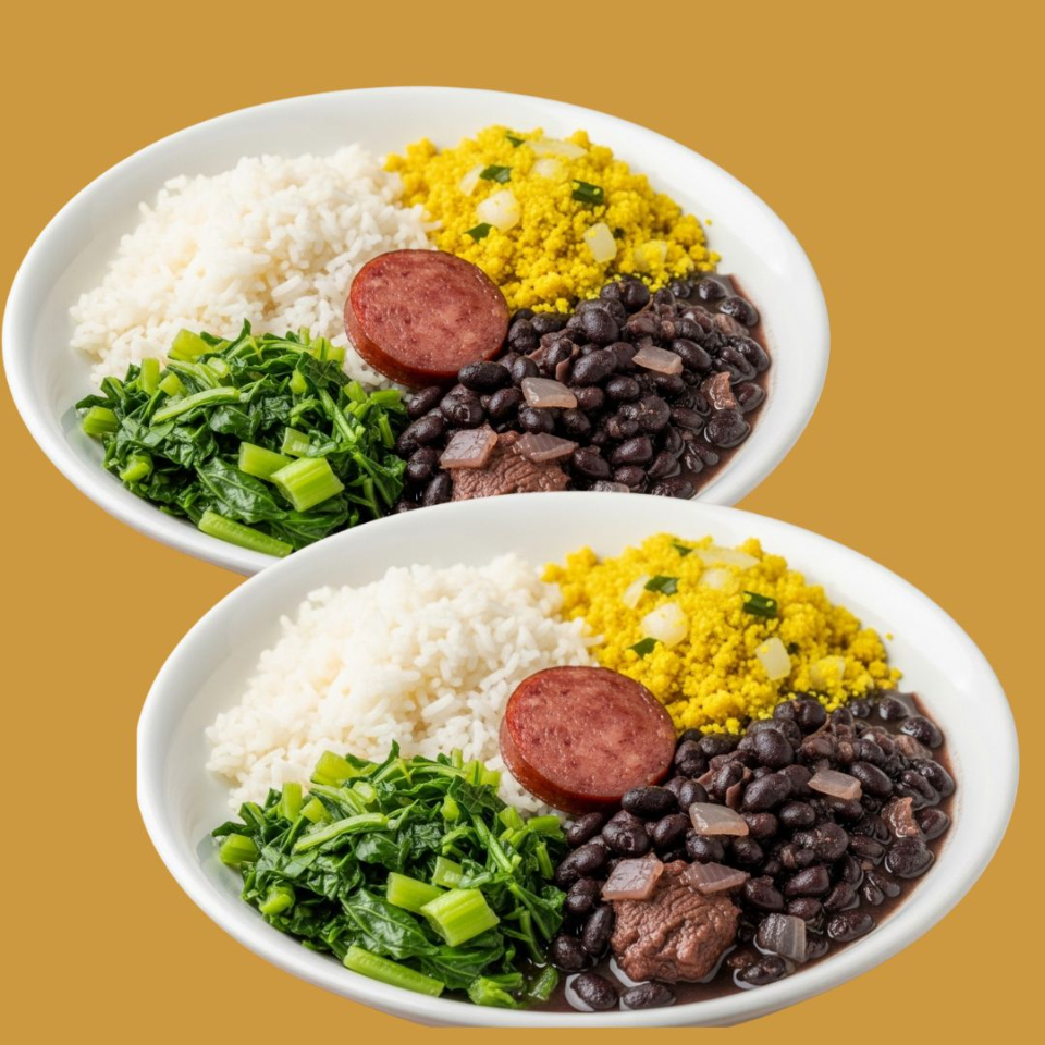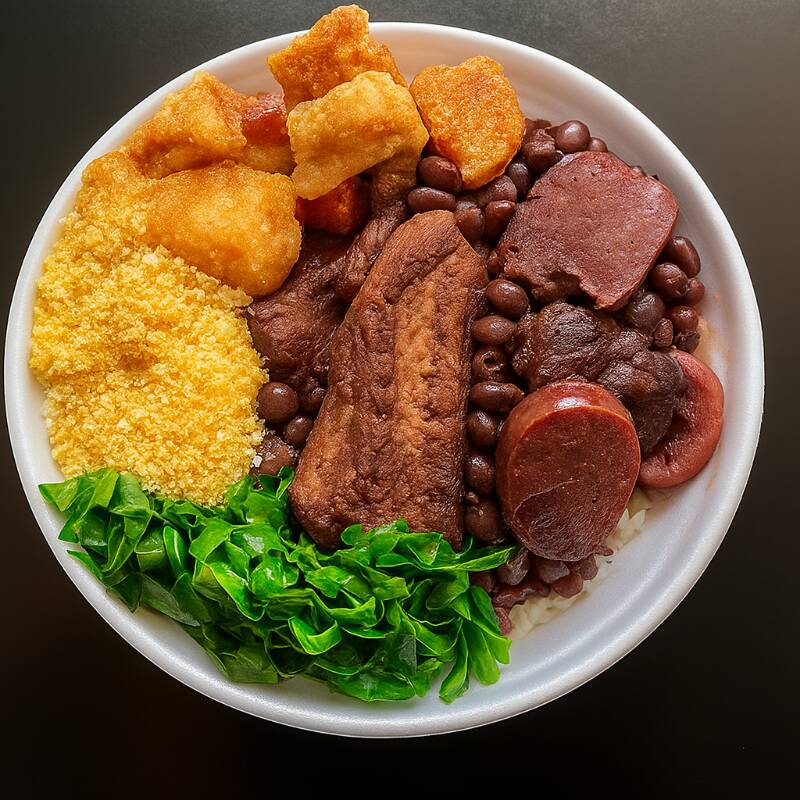 Feijoada caseira com arroz branco soltinho, farofa douradinha e couve refogada. Sabor de tradição, feita com carinho para aquecer seu dia.