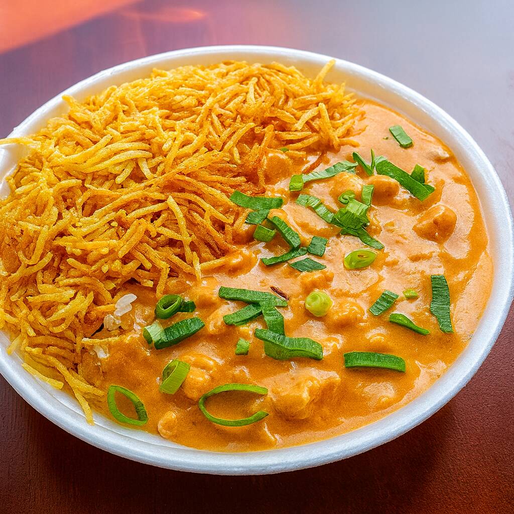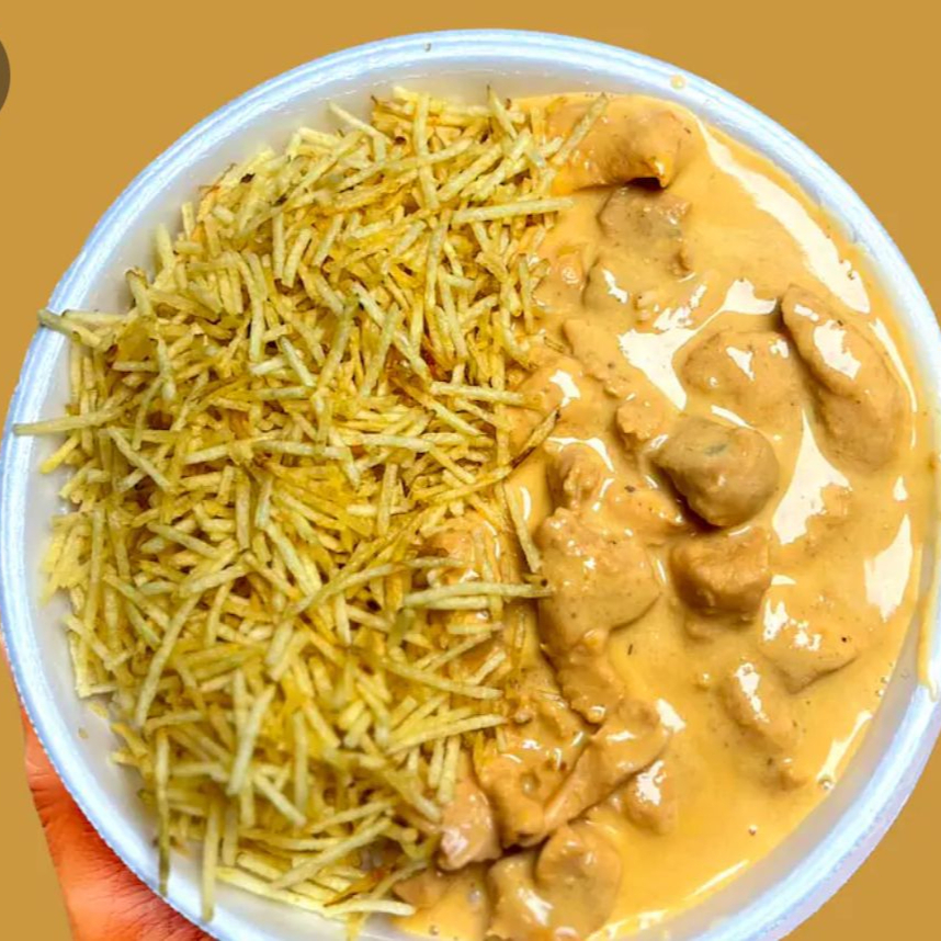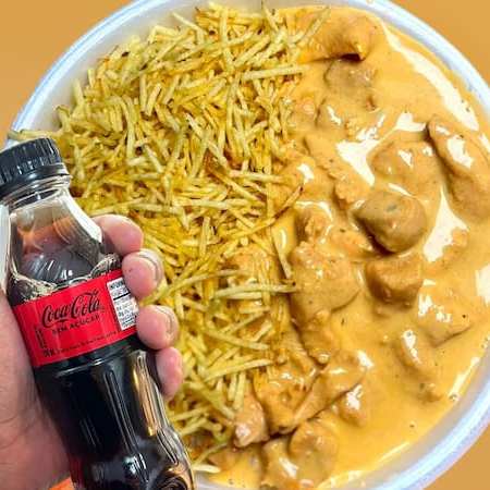 Strogonoff cremoso com arroz branco soltinho e batata palha crocante. Uma combinação clássica, feita com carinho, que entrega sabor e aconchego em cada garfada.