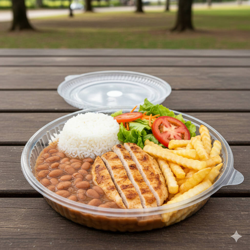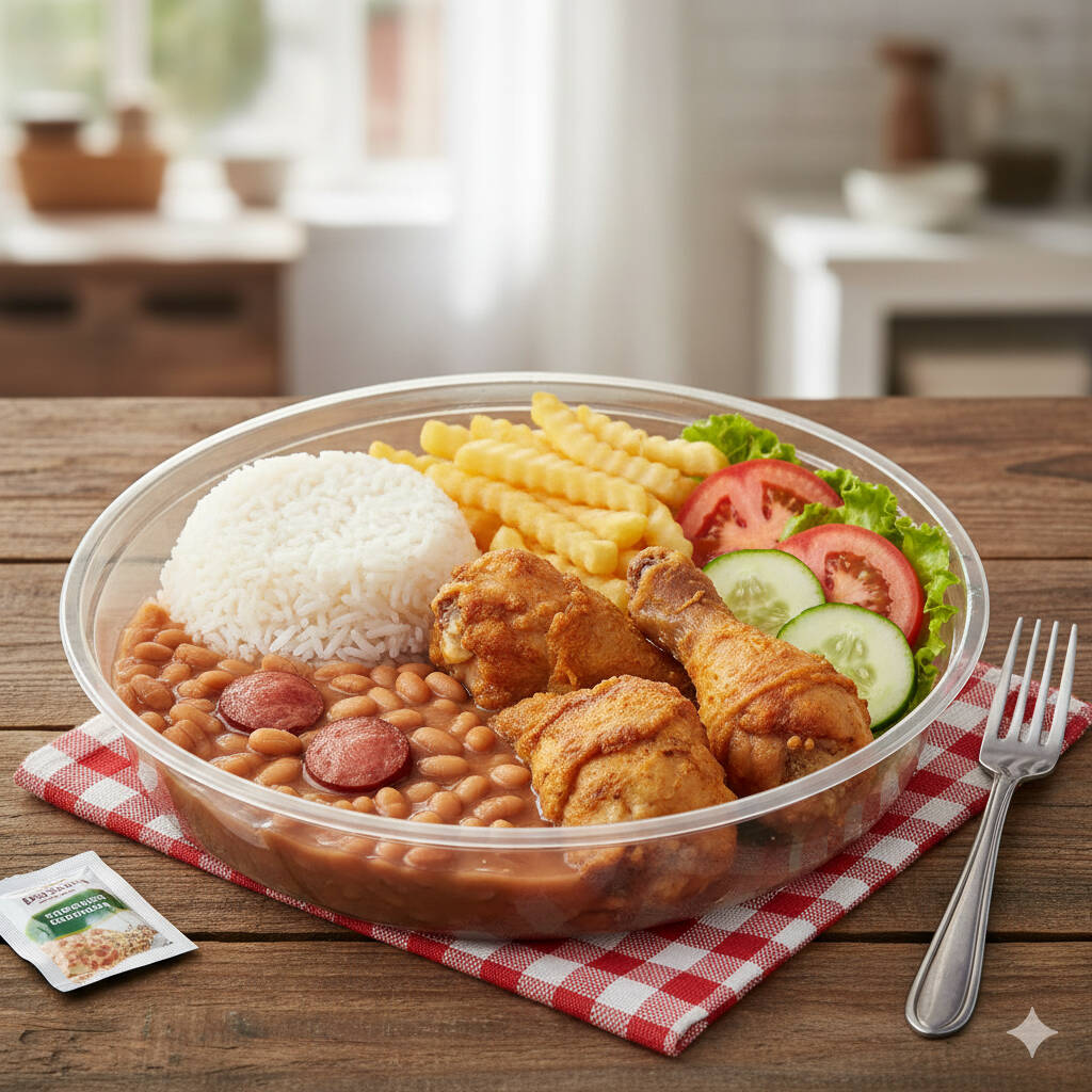 Arroz Branquinho e Soltinho, Feijão de Caldo, Frango Frito e Batata Frita Crocante. Acompanha Salada e Molho Para Salada Separado.