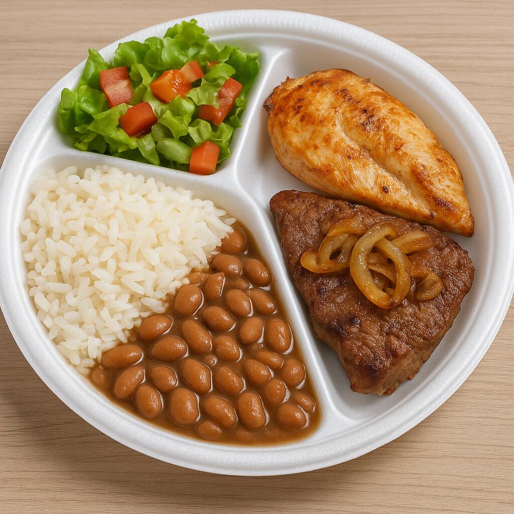 Arroz Branquino e Soltinho, Feijão de Caldo, Bife Bovino Acebolado e Frango Grelhado, Acompanha Salada e Molho Para Salada Separado.