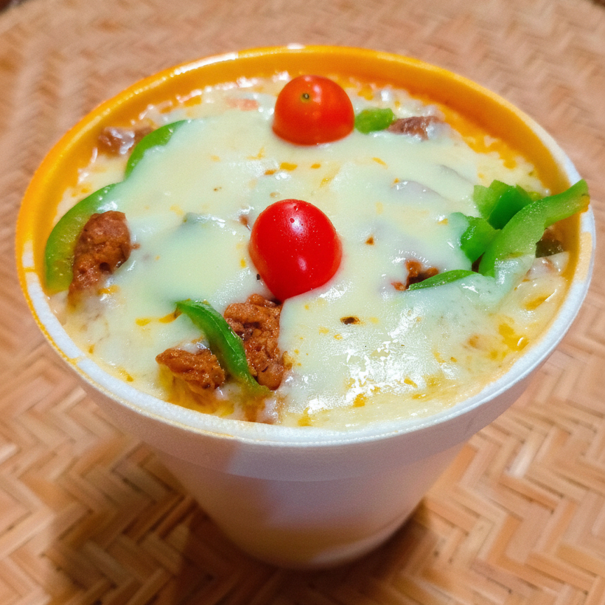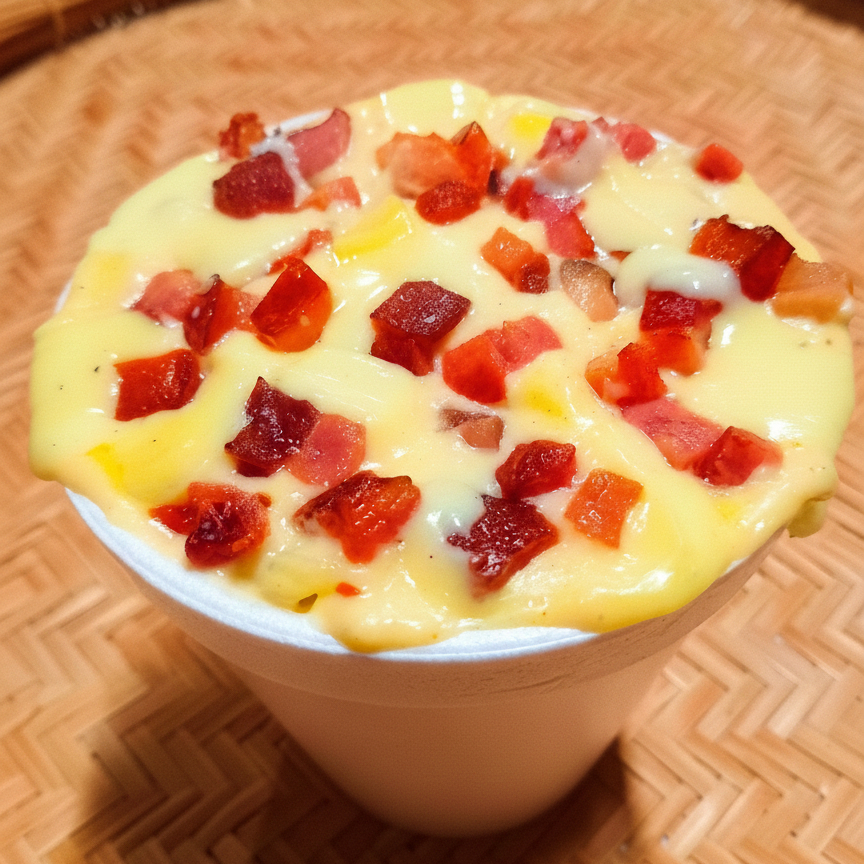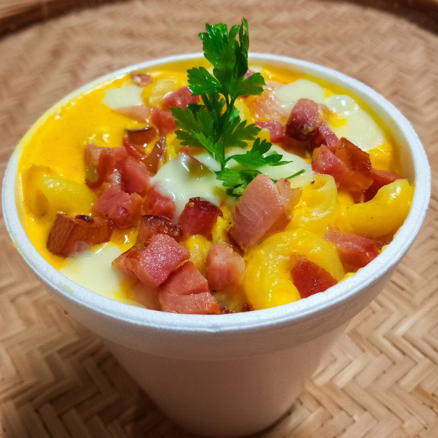 Macarrão Caracol, Queijo Cheddar, Bacon, Mussarela e Requeijão Cremoso.