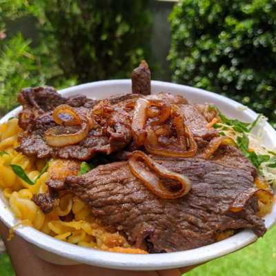 Macarrão espaguete salteado com tiras de carne bovina, legumes frescos e molho especial choyo