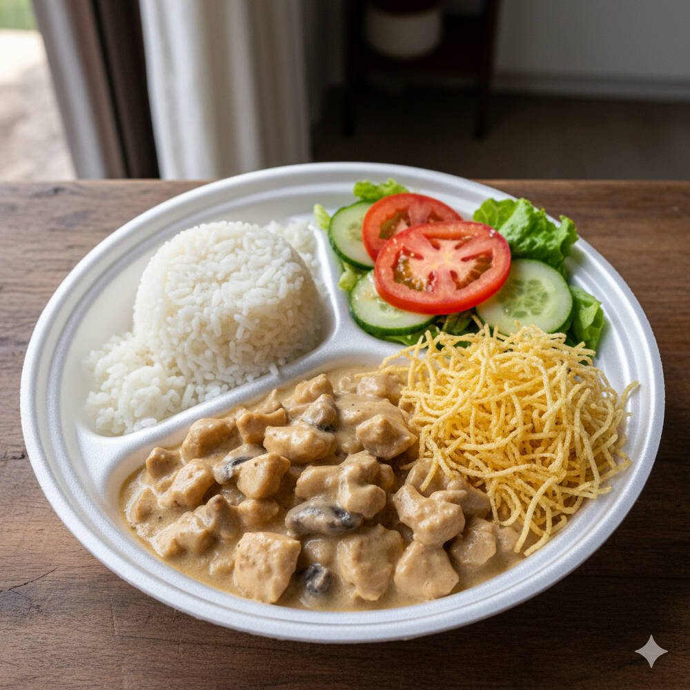 Arroz Branquino e Soltinho, Strogonoff de Frango Cremoso, Batata Palha, salada separada.
