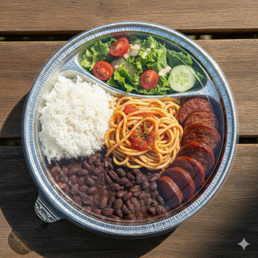 Arroz, Feijão de Caldo, Macarrão Suculento, carne moída Frita. Acompanha Salada e Molho Para Salada Separado.