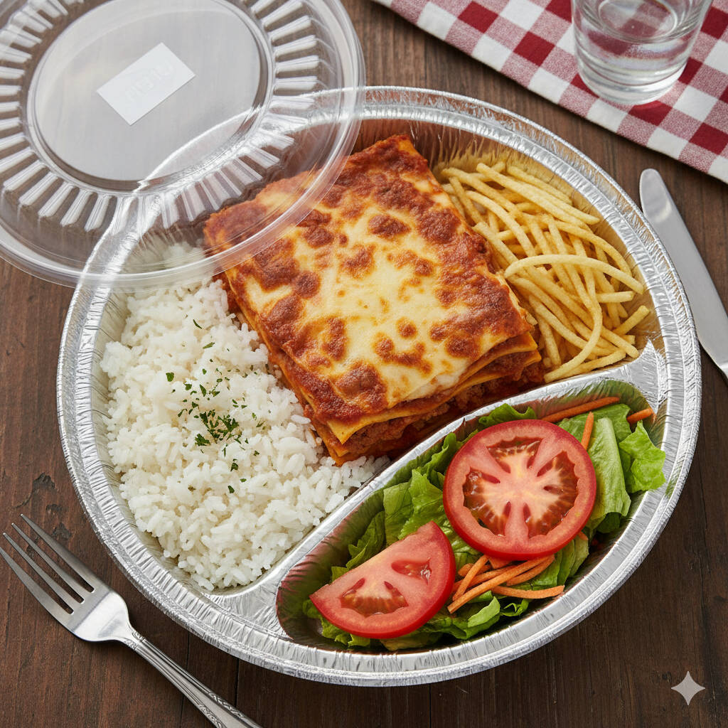 Arroz Branquinho, Lasanha, Batata Palha e Salada.