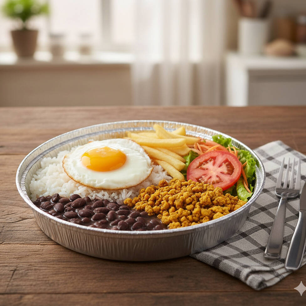 Vegetariana. Arroz Branquinho e Soltinho , Feijão de Caldo, Ovo Frito , Carne de Soja e Batata Frita. Acompanha Salada e Molho para Salada Separado.