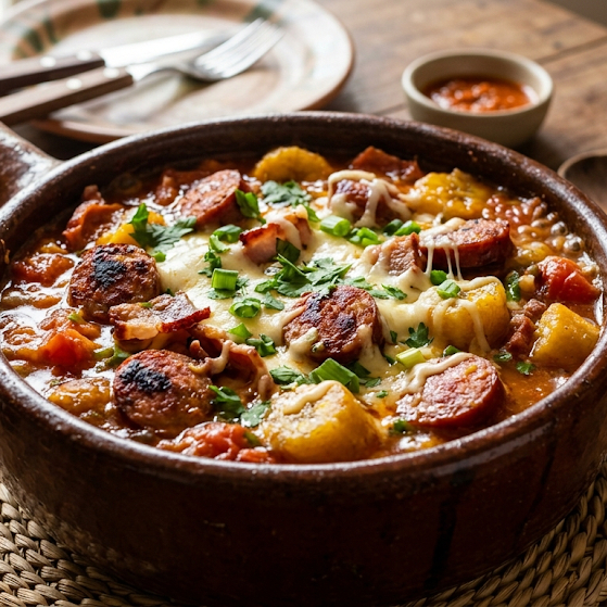 Linguiça de Porco, Calabresa, Bacon, Milho Verde, Tomate, Banana e Queijo Mussarela.