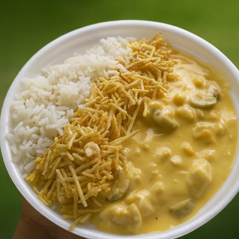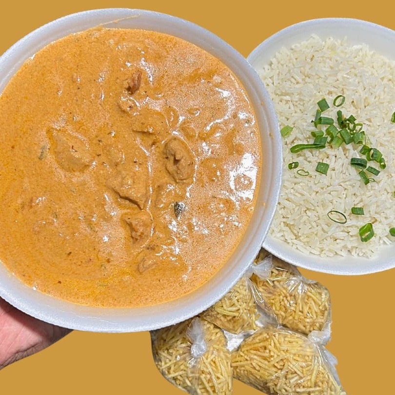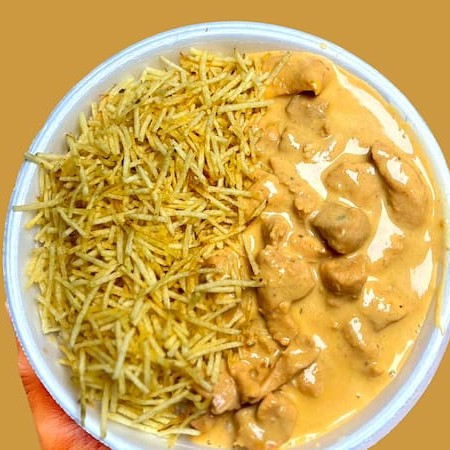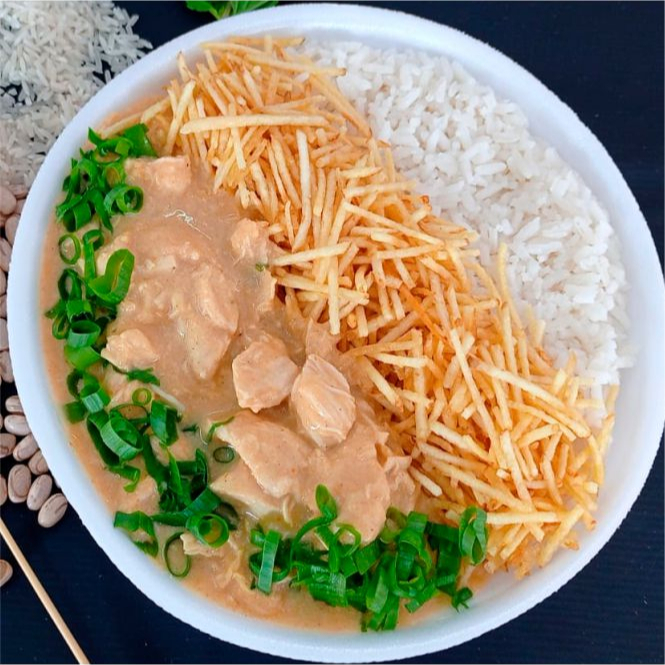Strogonoff cremoso com arroz branco soltinho e batata palha crocante. Uma combinação clássica, feita com carinho, que entrega sabor e aconchego em cada garfada.