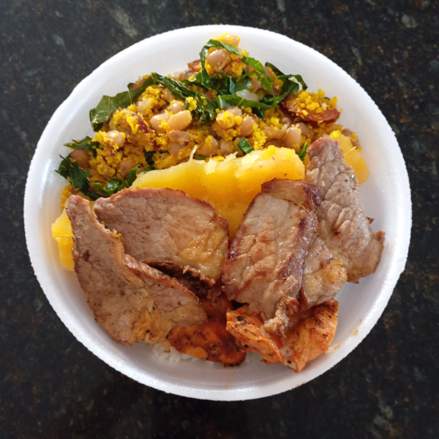 Churrasco de carne bovina, assado na brasa e selado na chapa + Feijão tropeiro irresistível + Arroz branquinho + Mandioca cozida macia + Mix de Milho e Ervilha. O verdadeiro sabor da roça na sua mesa!