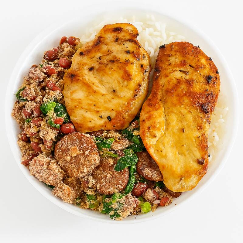 Arroz Soltinho e nosso famoso Tropeiro com calabresa . Acompanha Mandioca de Raiz selecionada . Estrela do prato: Filé de Frango (dourado na chapa com tempero exclusivo).