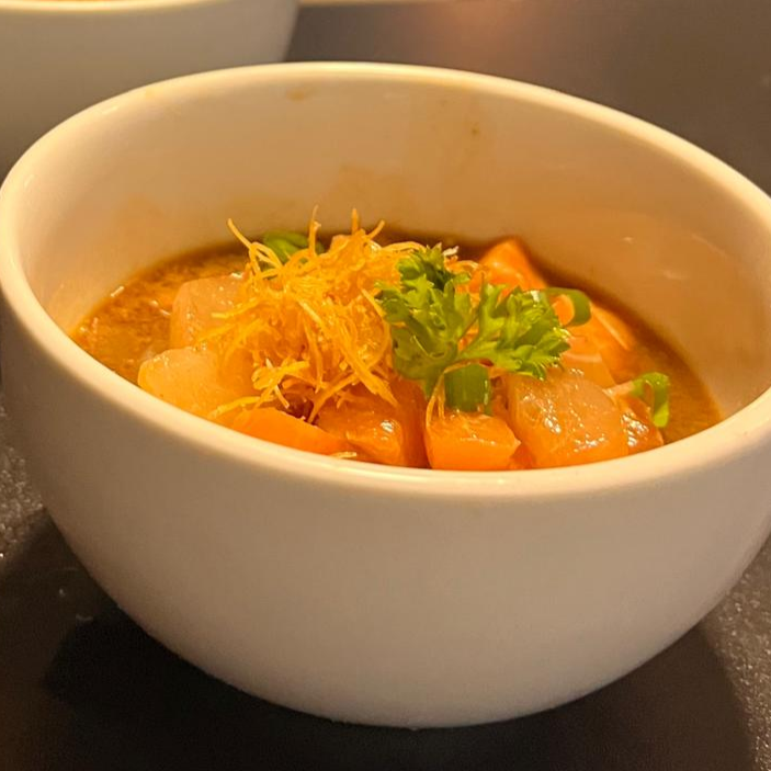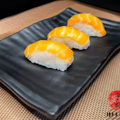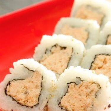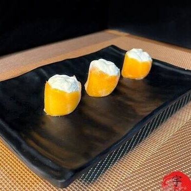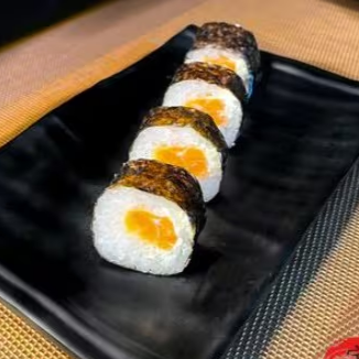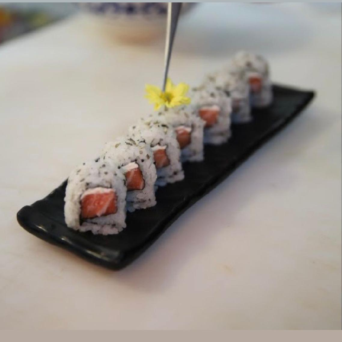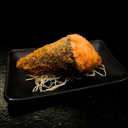Pate de salmão, cebolinha, arroz japones, alga e cream cheese, empanado em fatinha panko e frito.