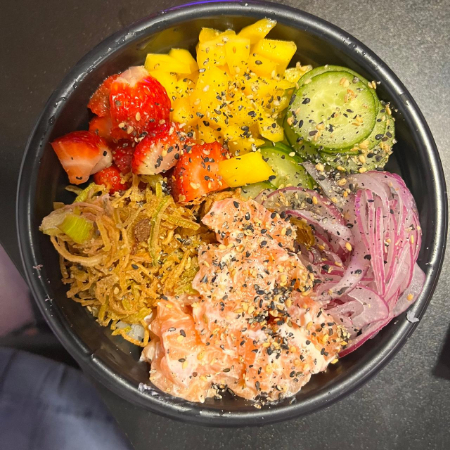 Complemente com quatro ingredientes(manga,kiwi,sunomono,alho poró,morango,tomate cereja,kani,cebola roxa ) finallizaçao : tarê ou cryspi de trigoDesfrute da experiência personalizada de montar o seu próprio 'Poke'. Este prato traz uma base de arroz, delicadamente temperada com nosso molho tare, exaltando um sabor oriental distinto e autêntico.