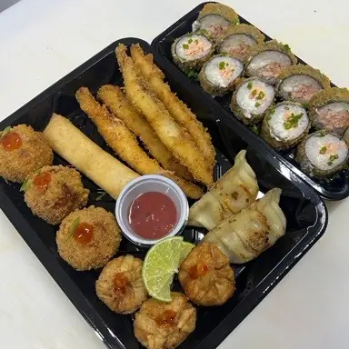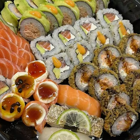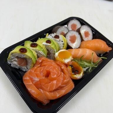 10 Uramaki(diversos) , 6 Gunkan, 10 Hossomaki(diversos) , 5 Niguiri , 8 Sashimi(4 salmão e 4 Tilápia ) e 15 Hot Philadelphia.