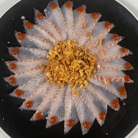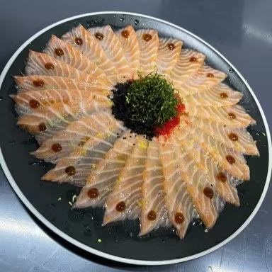 20 Fatias laminadas de salmão marinadas em molho cítrico especial.