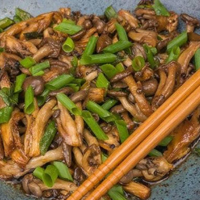 COGUMELOS SHIMEJI REFOGADOS NA MANTEIGA, SHOYU, SAQUE, CEBOLINHA . 180g