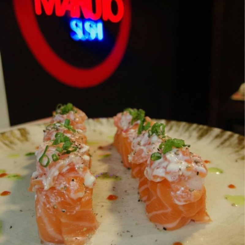 Cubos de salmão, cebolinha, arroz japones, alga e cream cheese. * Acompanha hashi, molho tarê e shoyu.