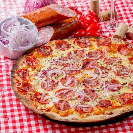 Deliciosa Pizza feita com Molho de Tomate, Mussarela, Calabresa Fatiada, Cebola, Oregano