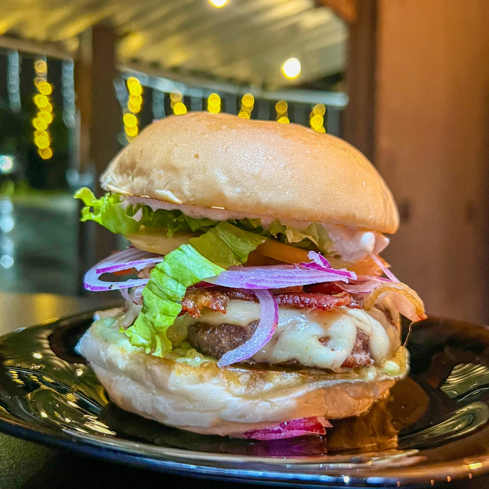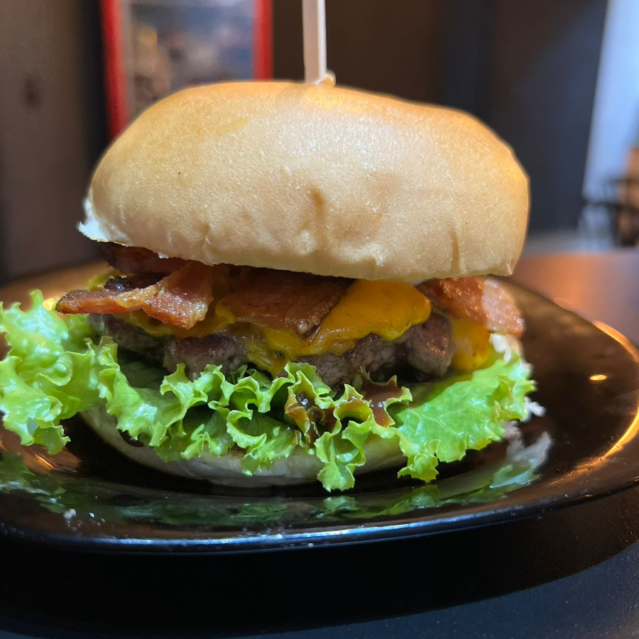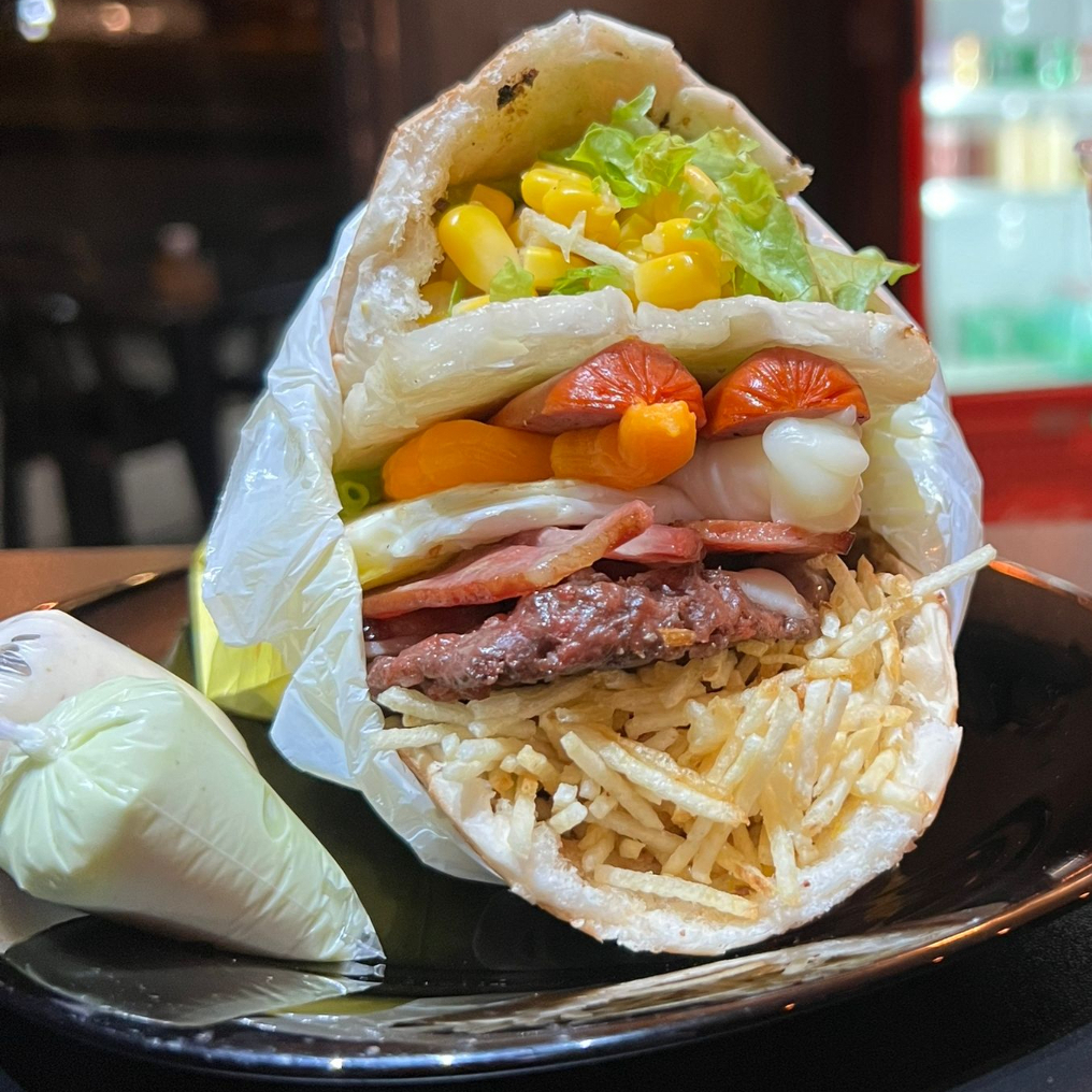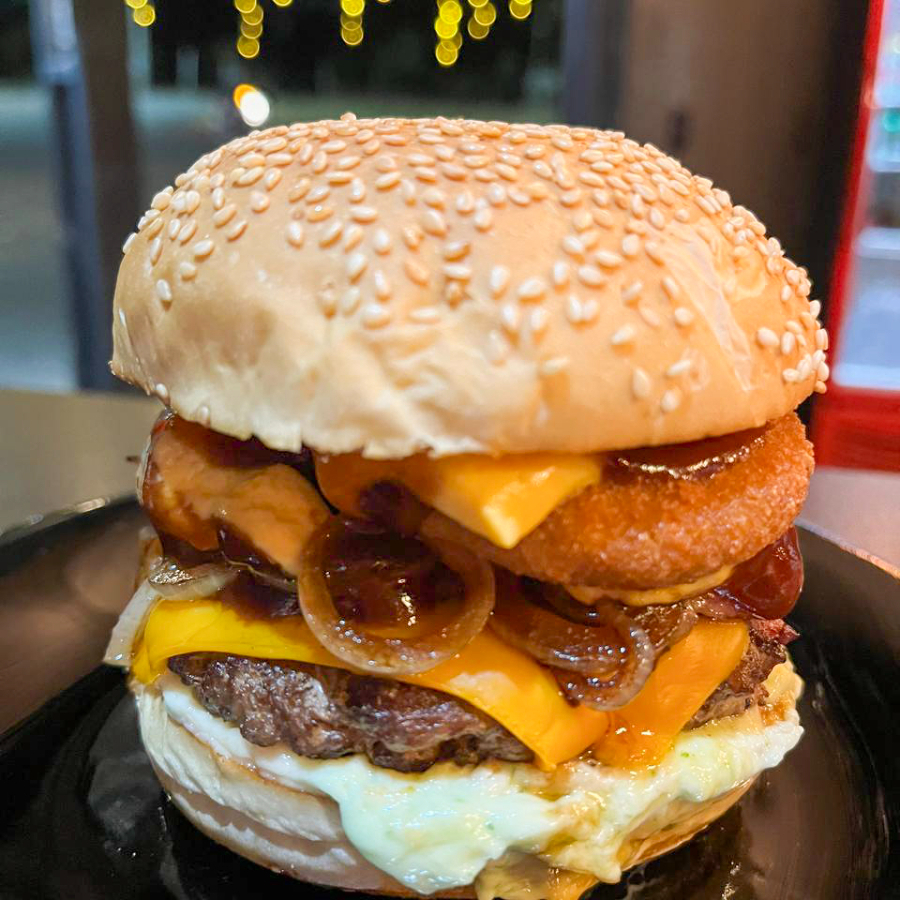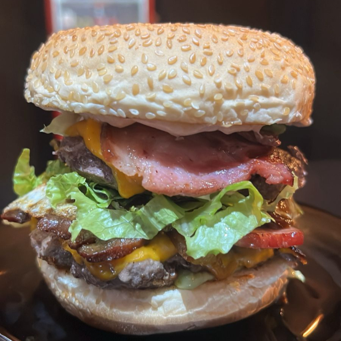 Pão, hambúrguer, bacon, ovo, salsicha, presunto, muçarela, alface, tomate, milho e batata