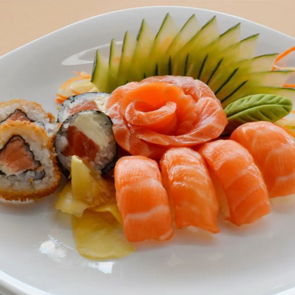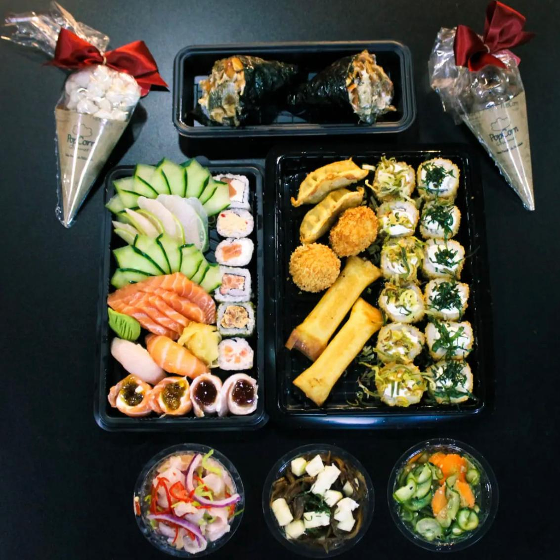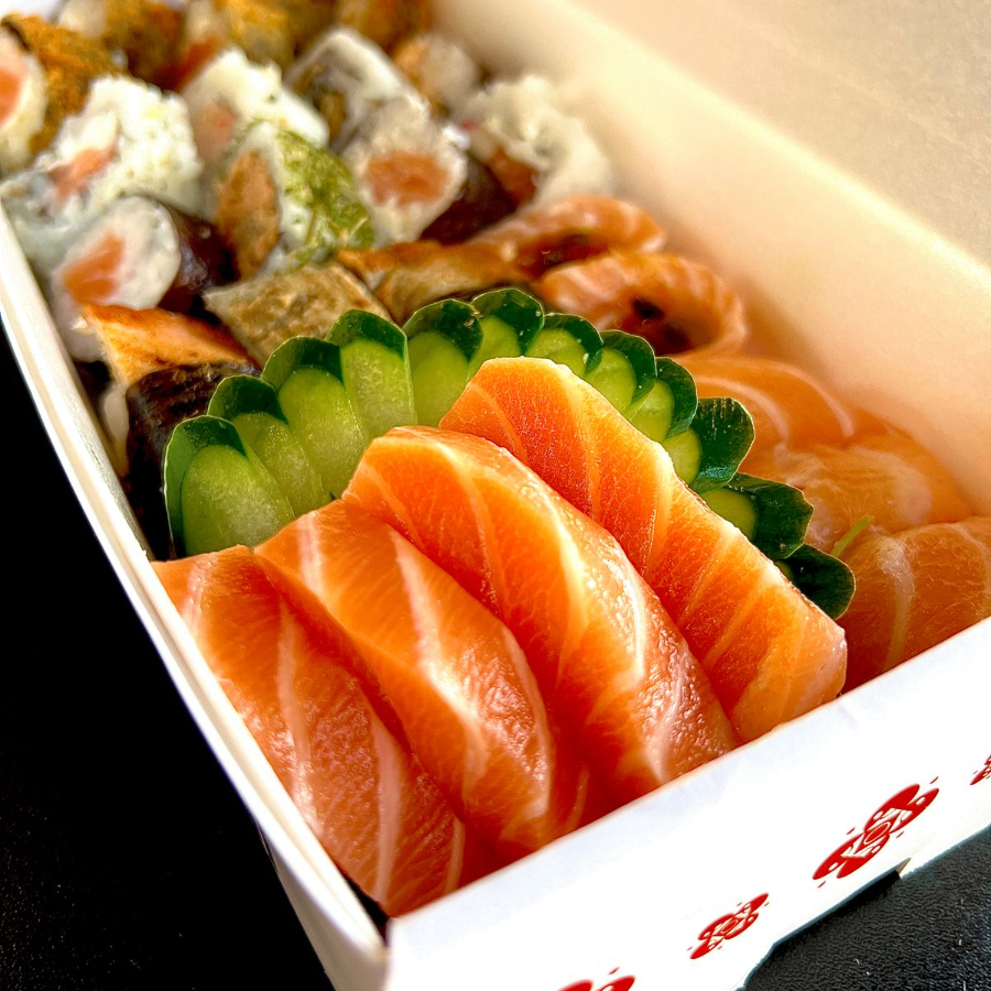 3 sashimi de salmão, 2 gunkan especial de salmão, 3 niguiri skin, 3 niguiri de salmão, 5 hot filadelfia e 8 sushis variados.