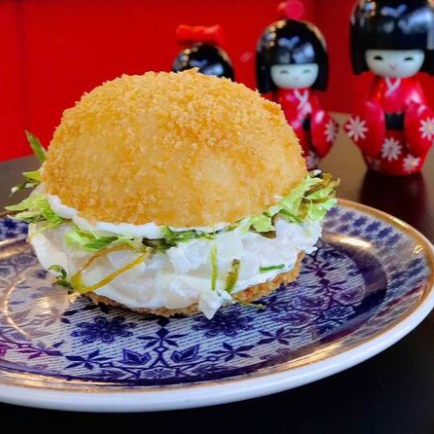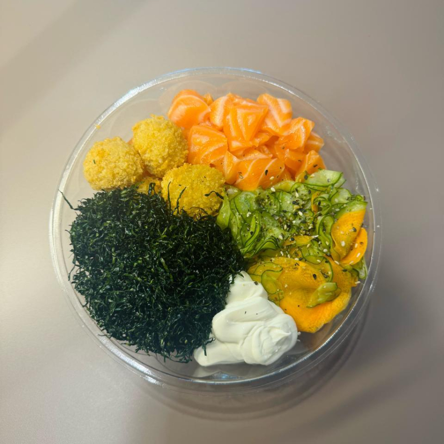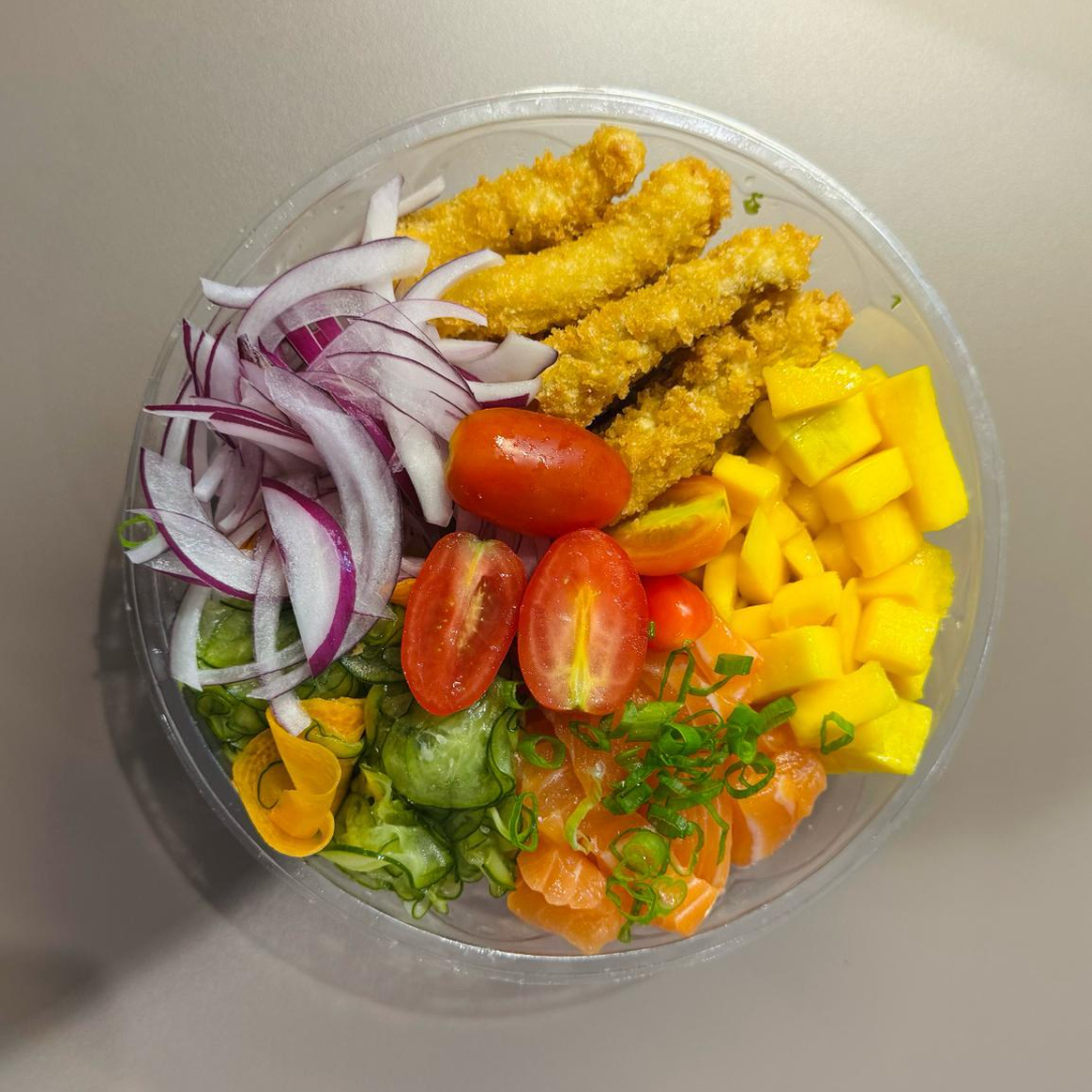 Arroz japonês, salmão em cubos, frango empanado, salada sunomono, cream cheese e crispy de couve.