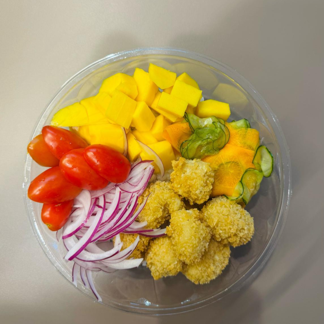 Arroz japonês, frango empanado, salada sunomono, cebola roxa, tomate cereja e manga.