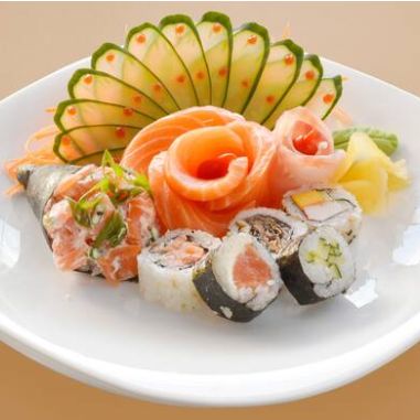 4 sashimi de salmão, 3 sashimi de tilápia, 1 mini temaki patê salmão, 5 sushis variados