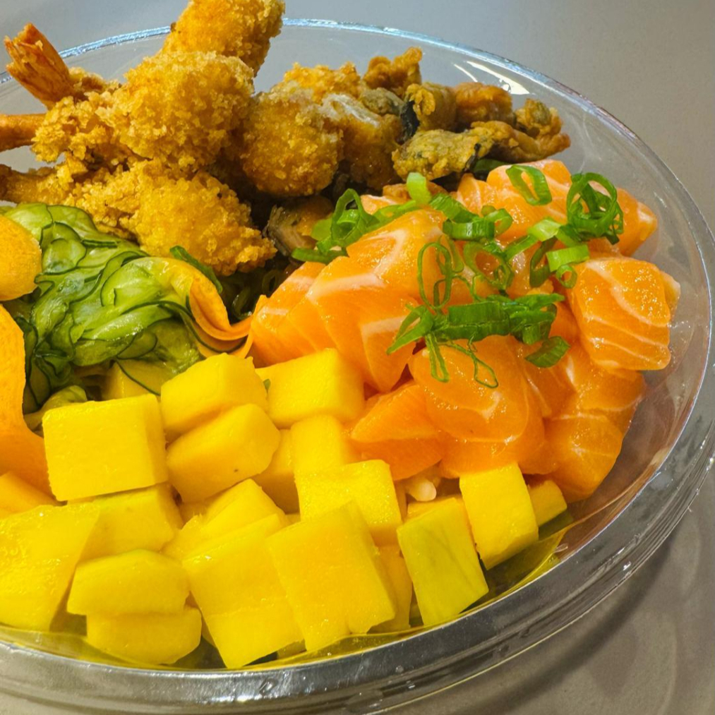 Arroz japonês, salmão em cubos, camarão empanado, salada sunomono, manga e skin de salmão.
