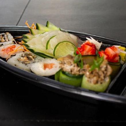 4 sashimi tilápia, 5 hot tori, 2 gunkan pepino com calda de morango, 1 gunkan pepino com shimeji, 1 niguiri califórnia, 4 sushis variados. Incluso: Teriaki, shoyo, hashi, gengibre e wassabi.
