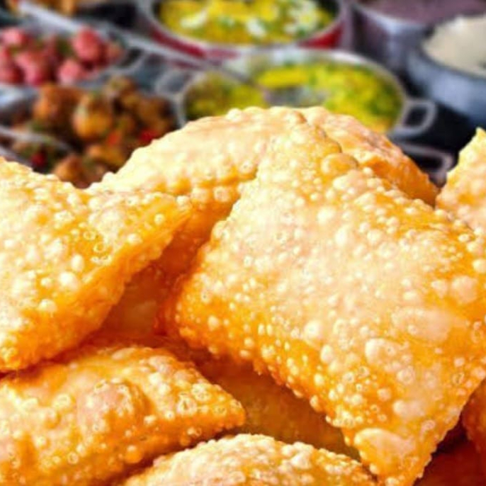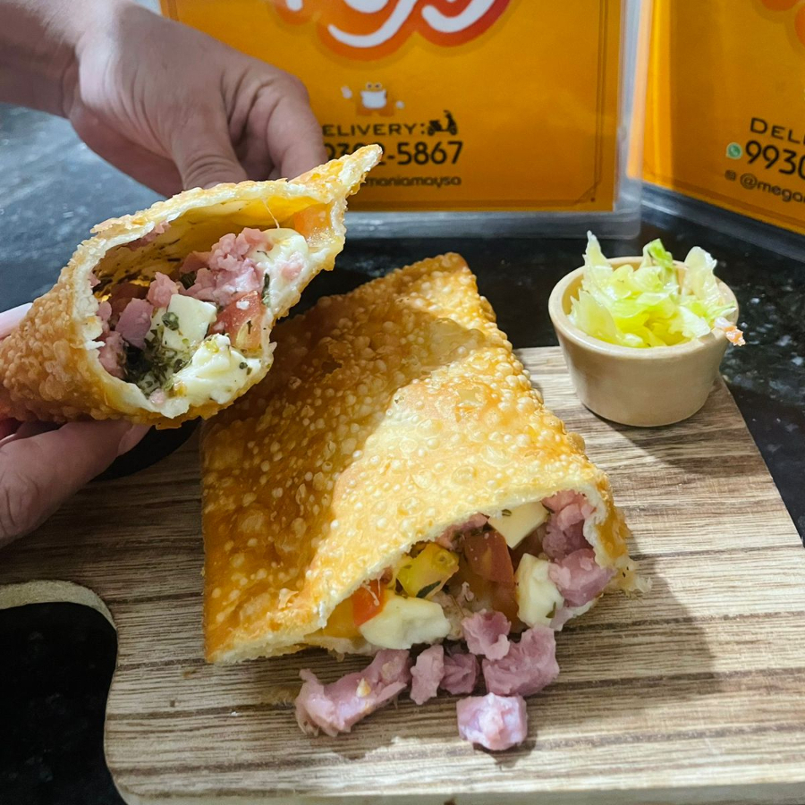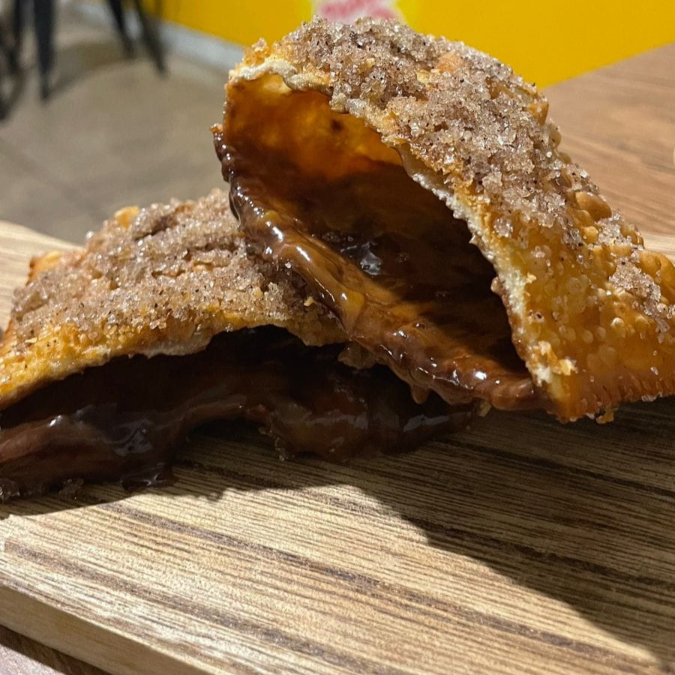 Pastel de Doce de 15cm com 4 opções de recheio(Banana, Chocolate, Goiabada, Doce de Leite) e acompanhamento grátis (Queijo, Canela e Açúcar).