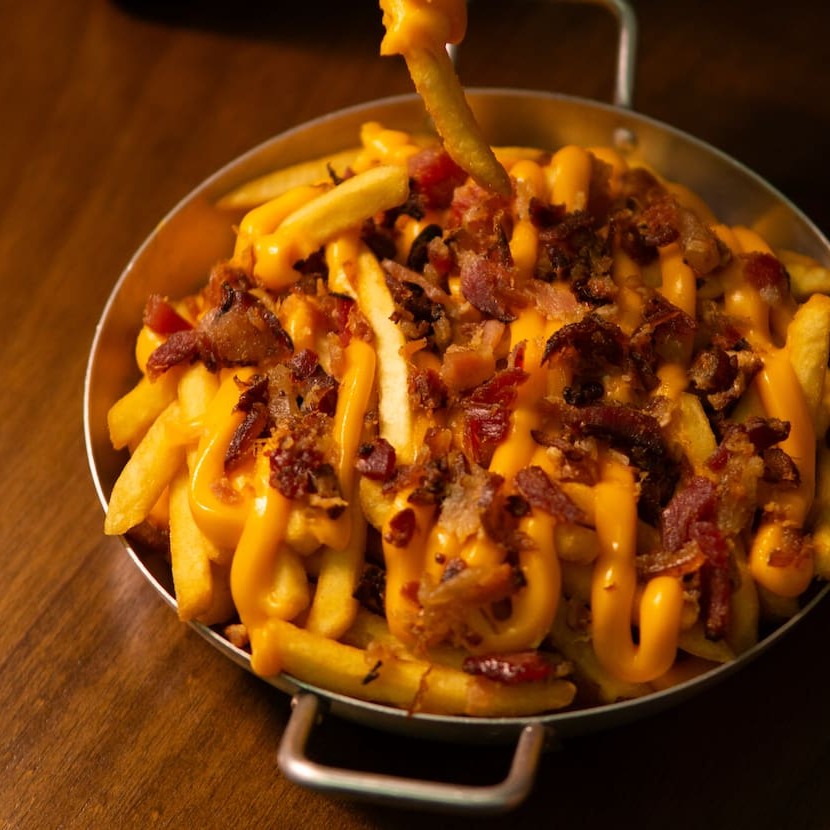 Deliciosa batata frita com cheddar e bacon sequinha e levemente salgada. Ideal para duas pessoas.