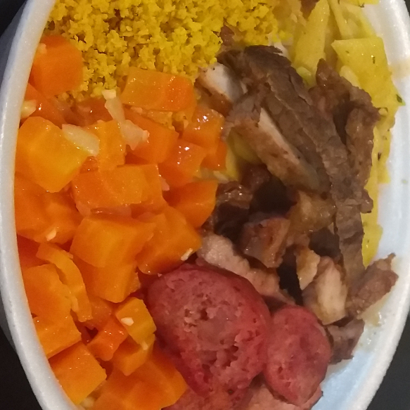 Arroz,feijão de caldo,macarrão,farofa,legume do dia,churrasco misto.
