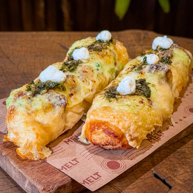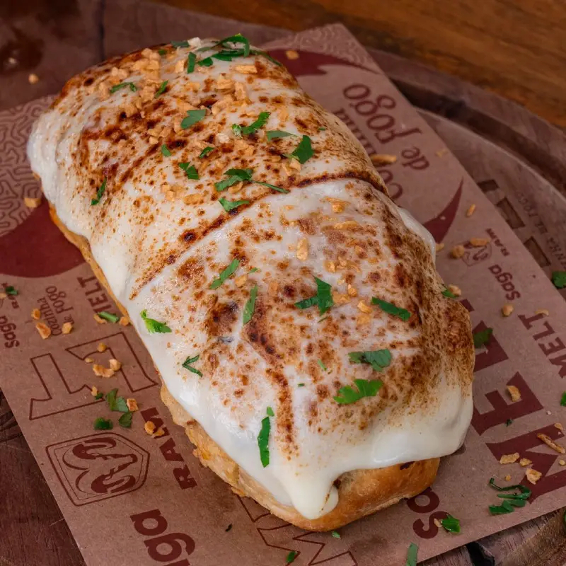 Pão de alho recheado com brisket defumado desfiado, coberto com emulsão de Dijon e queijo mozzarella gratinado e finalizado com molho chimichurri.