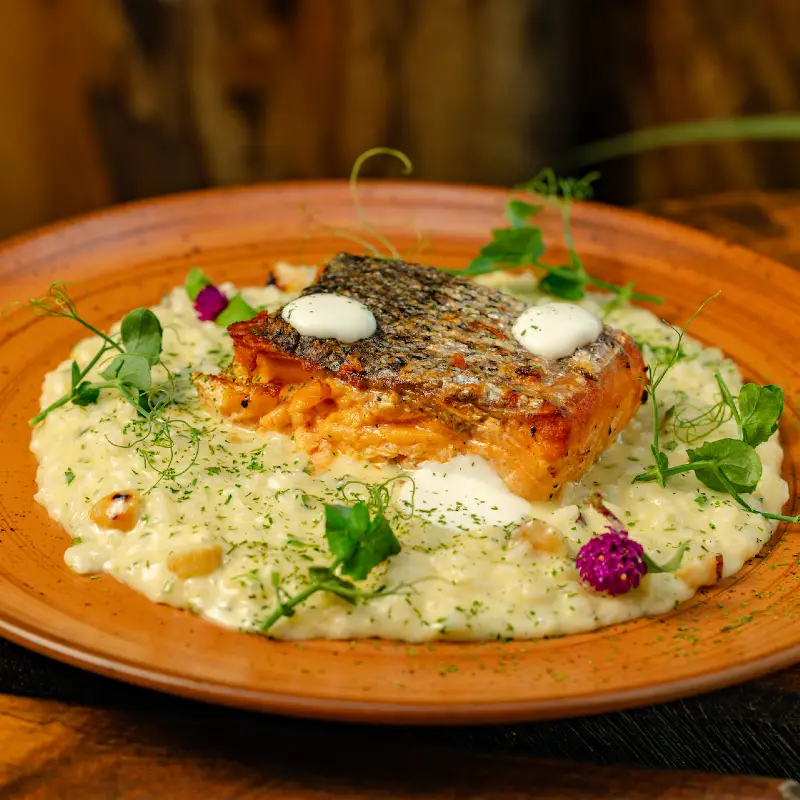 Salmão Grelhado, servido com risoto de grana padano e castanha do Pará.