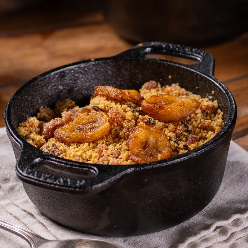 Carne serenada finalizada na parrilla e servida com queijo coalho, melaço de cana e farofa da casa.