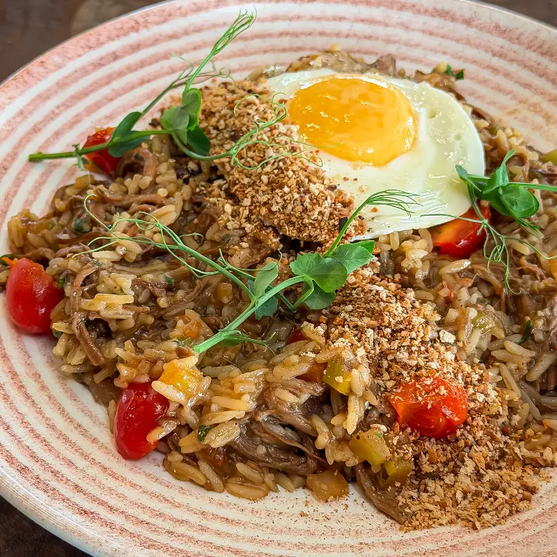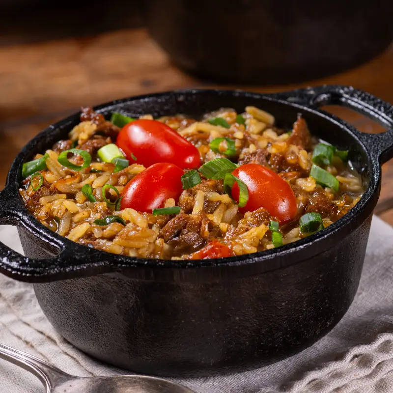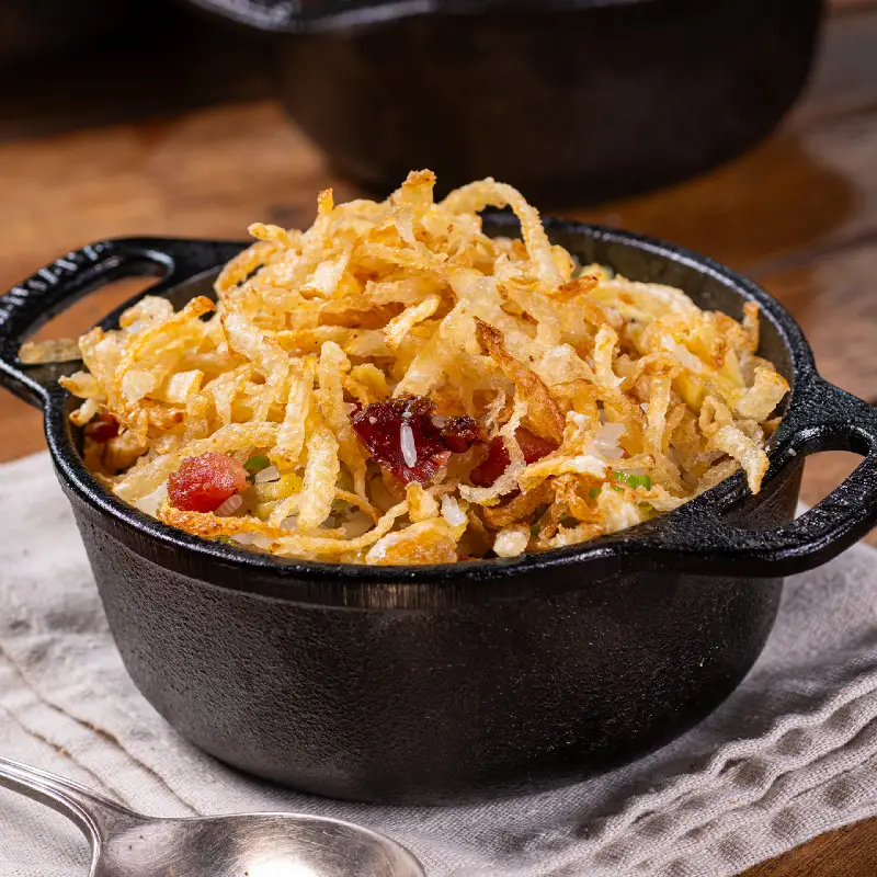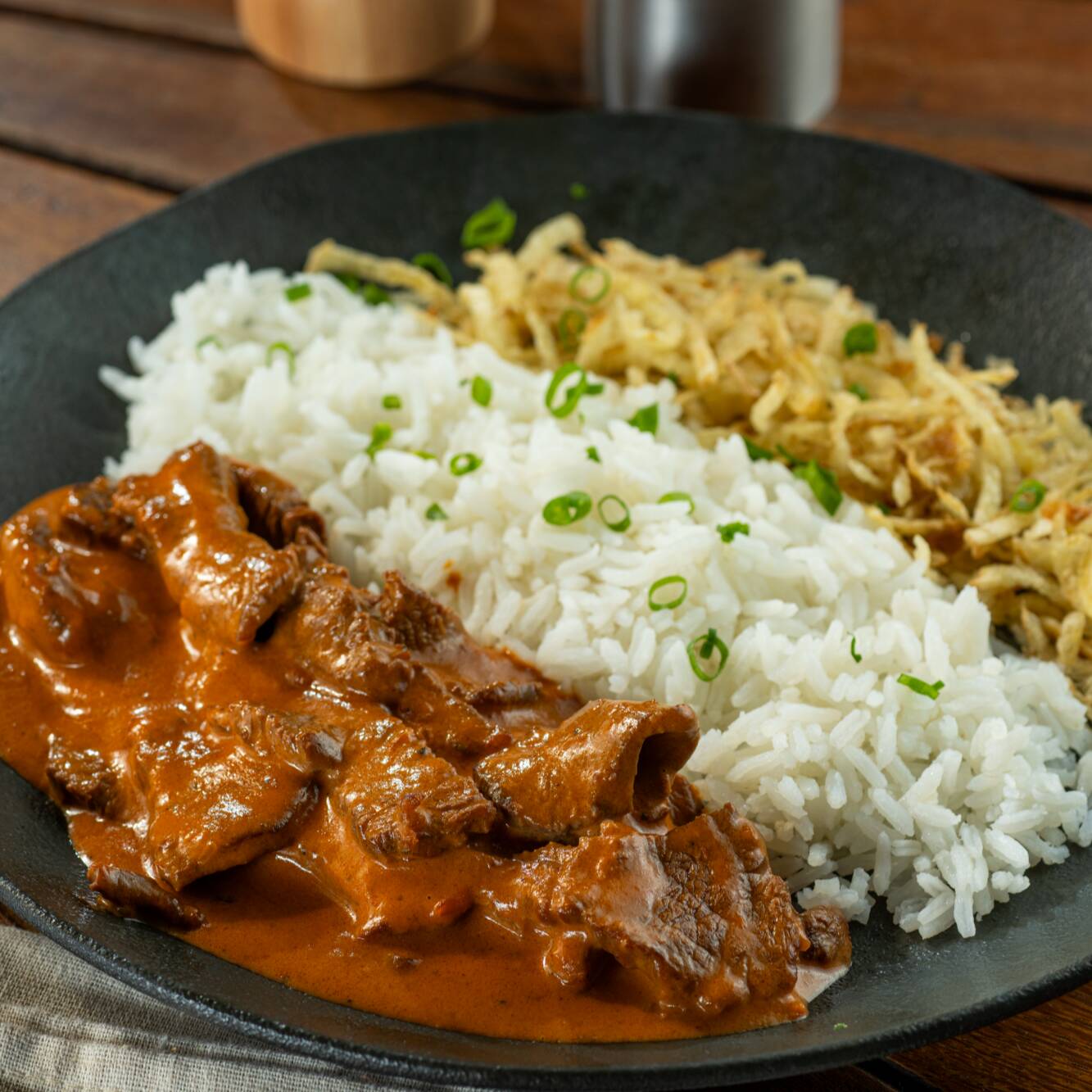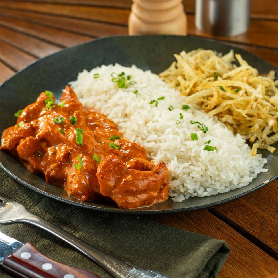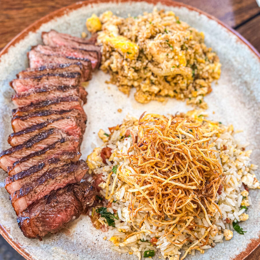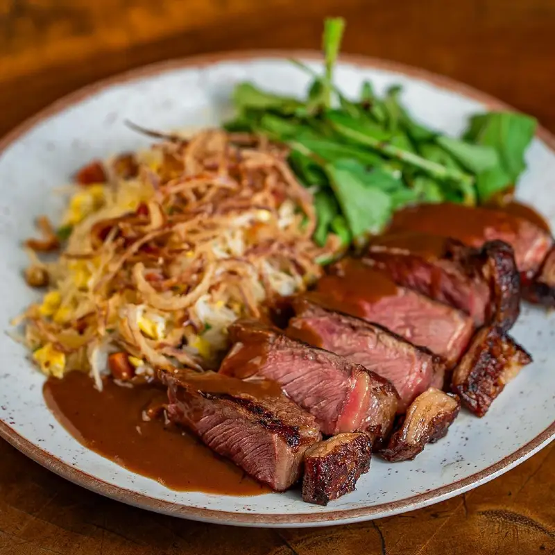Corte bovino na brasa, servido com molho demi glace, acompanhado de arroz biro biro, finalizado com batata palha e cebola crispy.