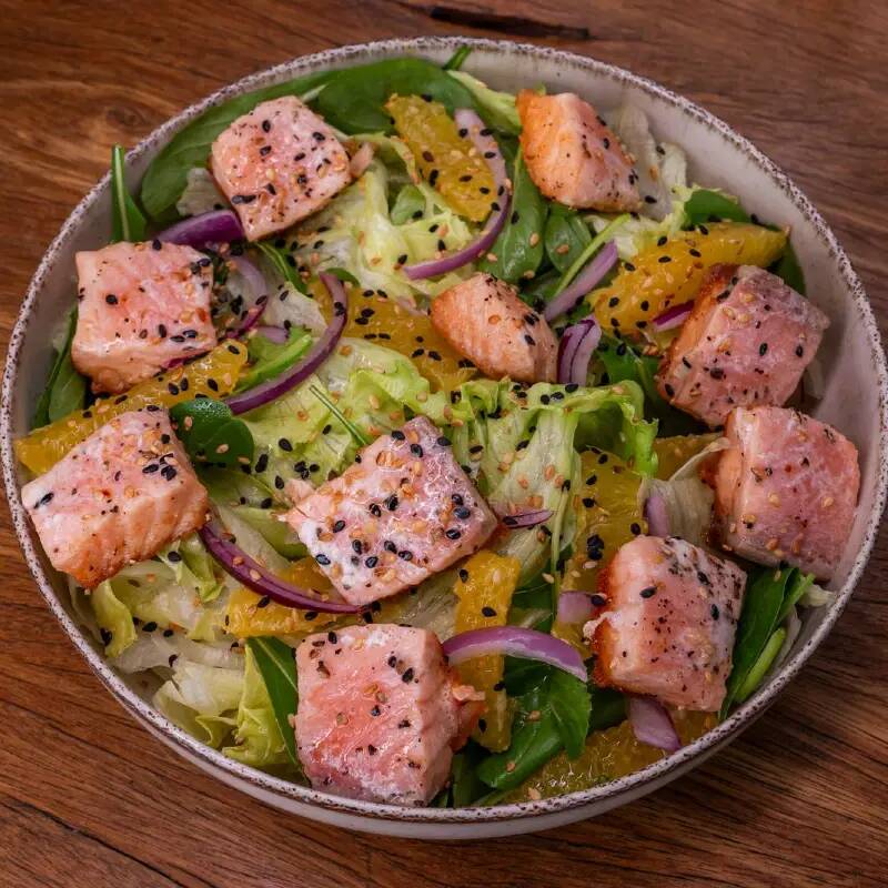 Alface americana, folhas de rúcula, cebola roxa, laranja bahia, cubos de salmão grelhado e finalizado com molho cítrico e gergelim.