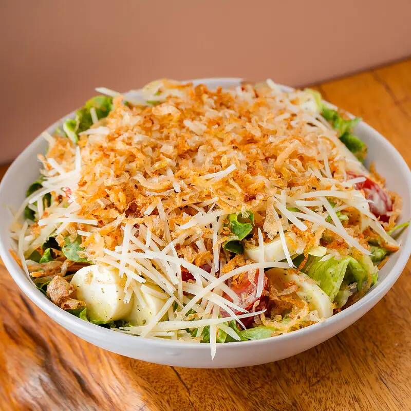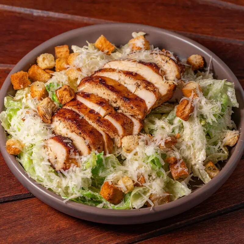 Alface americana, queijo parmesão ralado, frango grelhado, croutons e finalizado com molho caesar.