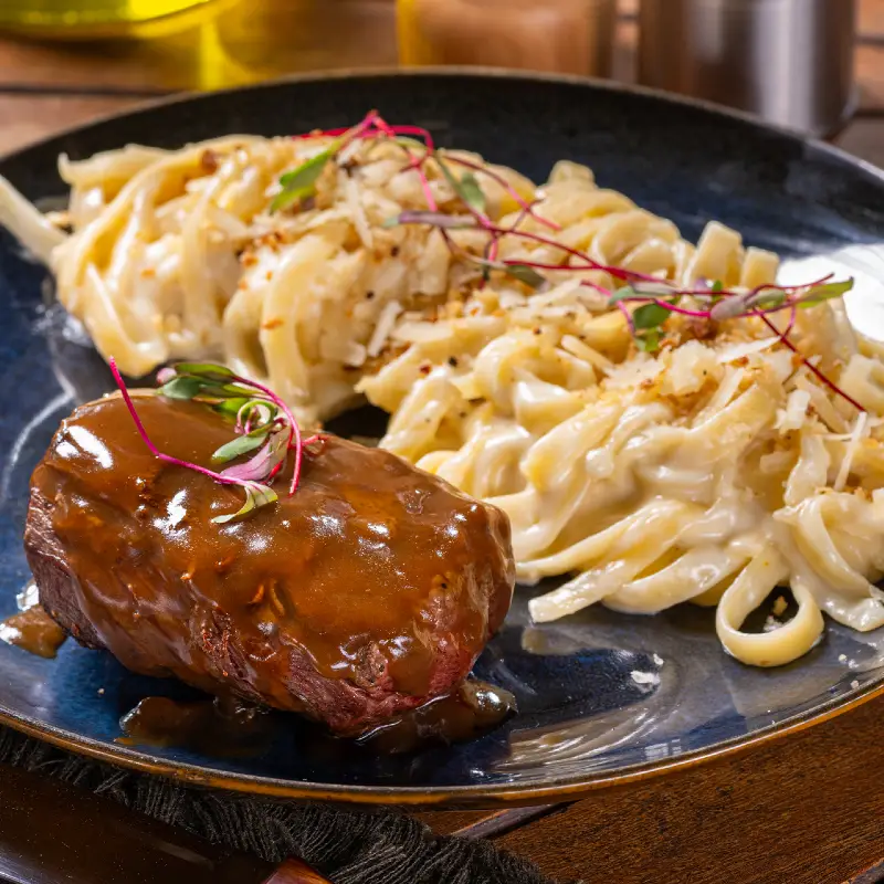 Massa fettuccine finalizada no queijo grana padano e filé mignon de parrilla com molho roti, para dar o toque especial, crocante de pão e castanha de baru.