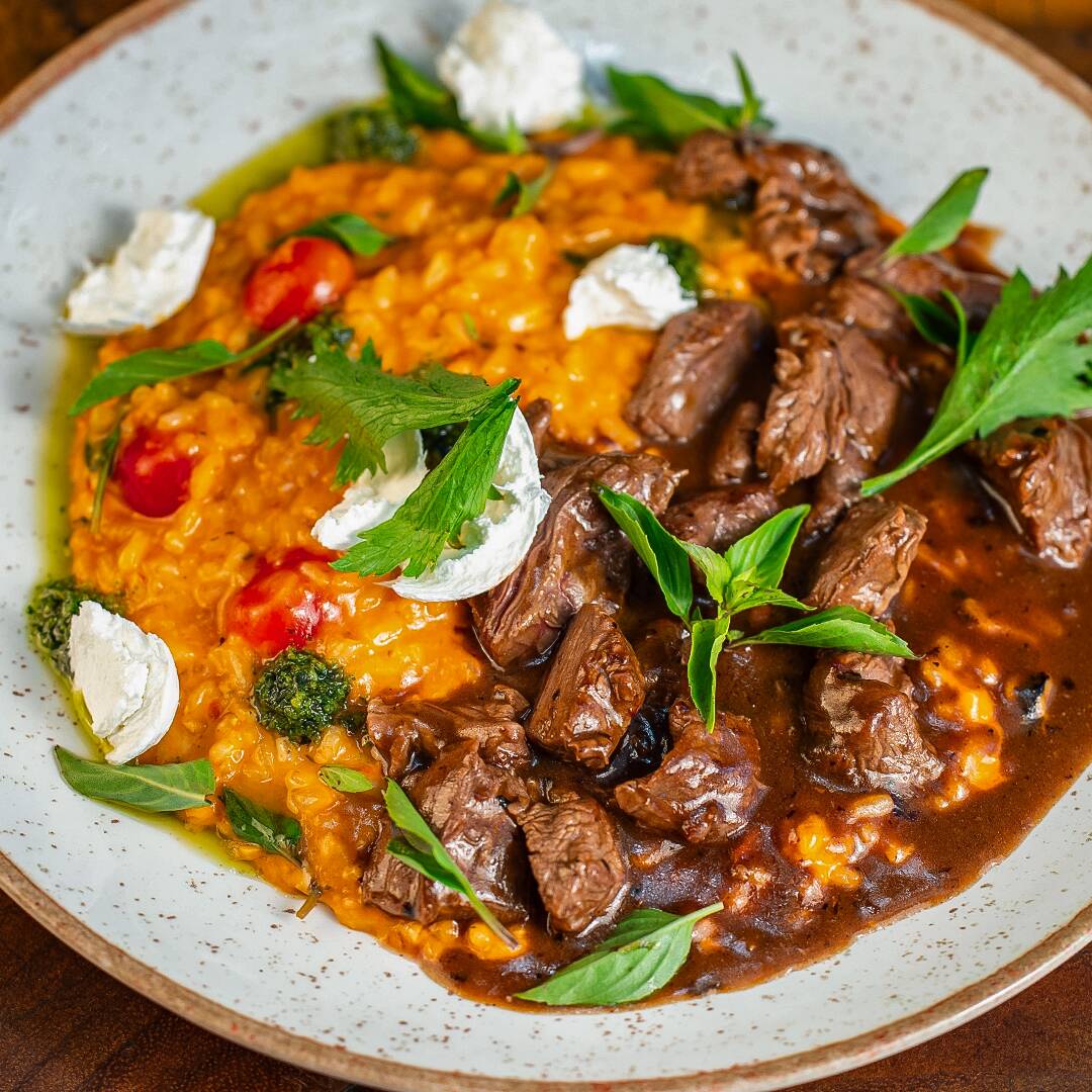 Cubos de mignon servido em seu próprio molho, acompanhado de risoto de tomate, finalizado com mozzarella de búfala fresca, pesto e manjericão.