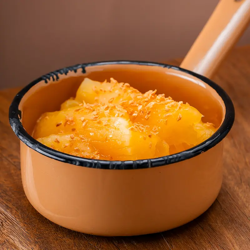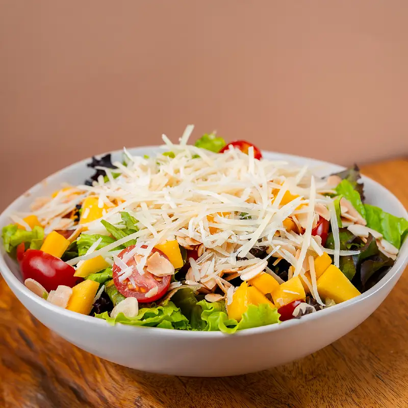 Mix de folhas selecionadas, tomate cereja, manga, azeitonas pretas, amêndoas laminadas, temperada com molho balsâmico e finalizada com queijo parmesão.