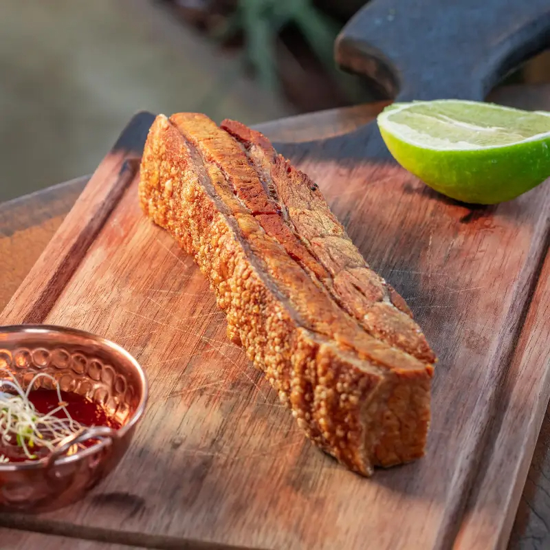 Corte especial da panceta mega crocante. Acompanha geleia de goiabada. *Imagem meramente ilustrativa