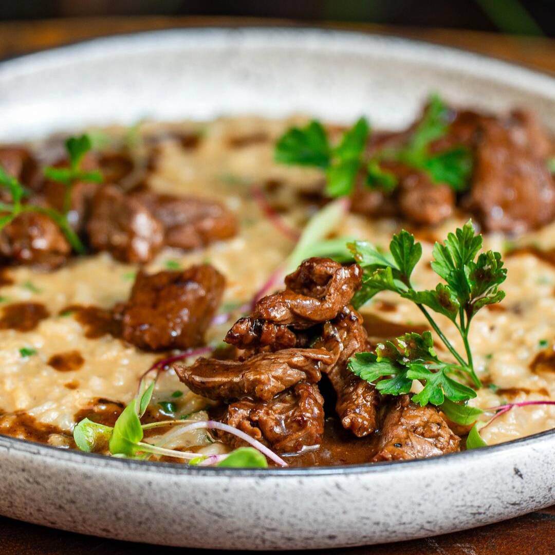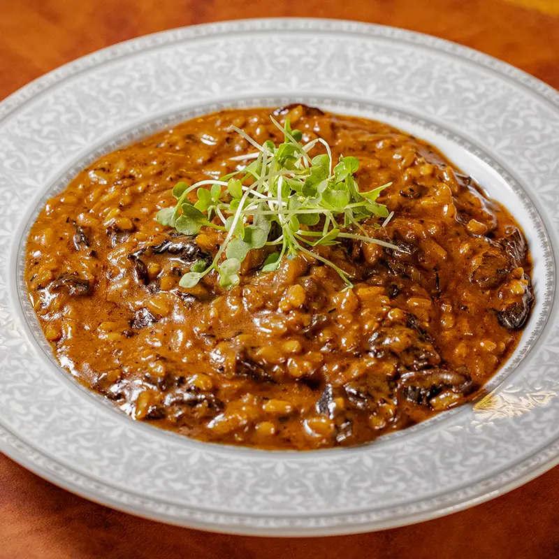 Risoto funghi levemente trufado, acompanhado de cubos de mignon em seu próprio molho.