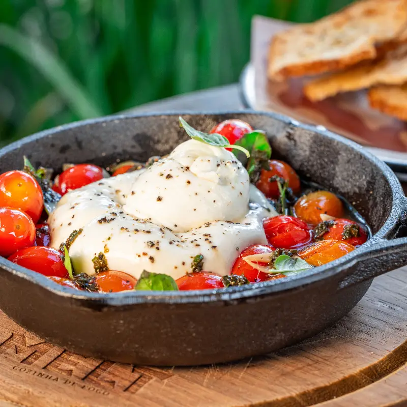 Um queijo fino, elegante e muito nutritivo, de sabor leitoso intenso, macia e cremosa, acompanhada de tomates cereja confitados, manjericão fresco e molho pesto.