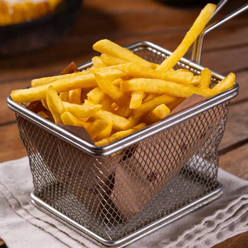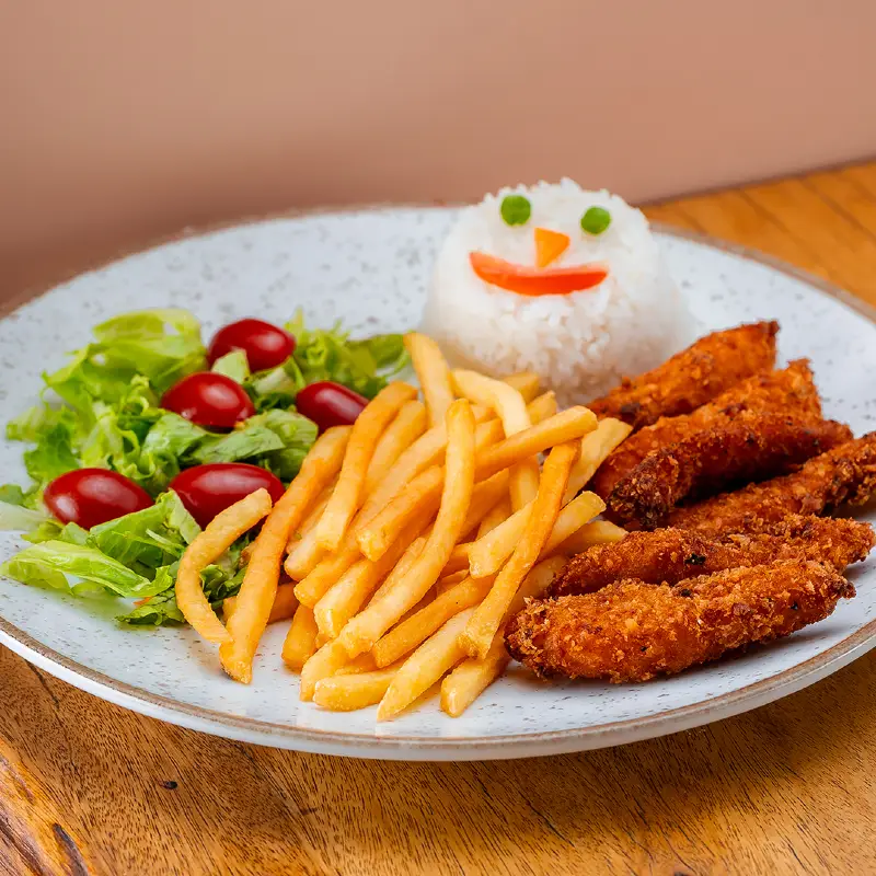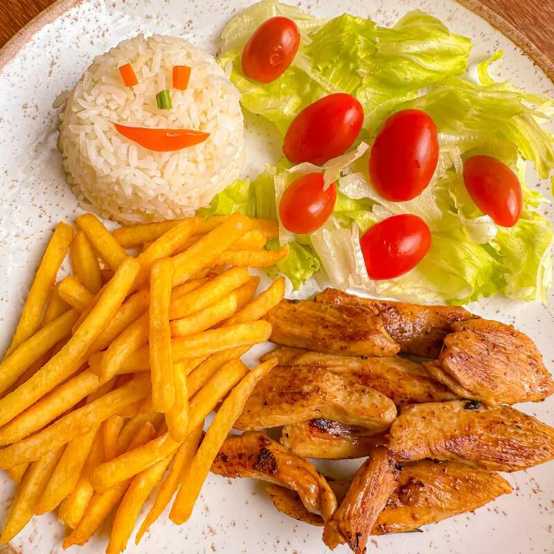 Iscas de frango grelhadas, Arroz Branco, Batata frita e saladinha de alface e tomate.